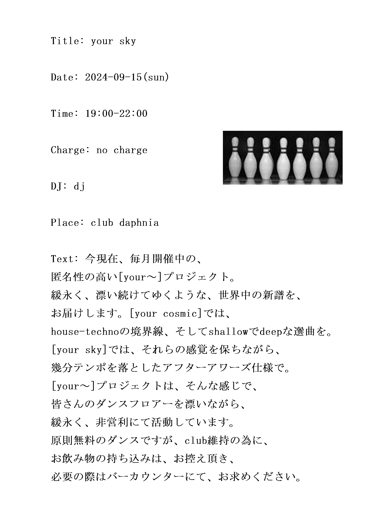 今現在、毎月開催中の、匿名性の高い[your~]プロジェクト。緩永く、漂い続けてゆくような、世界中の新譜を、お届けします。[your cosmic]では、house-technoの境界線、そしてshallowでdeepな選曲を。[your sky]では、それらの感覚を保ちながら、幾分テンポを落としたアフターアワーズ仕様で。[your~]プロジェクトは、そんな感じで、皆さんのダンスフロアーを漂いながら、緩永く、非営利にて活動しています。原則無料のダンスですが、club維持の為に、お飲み物の持ち込みは、お控え頂き、必要の際はバーカウンターにて、お求めください。